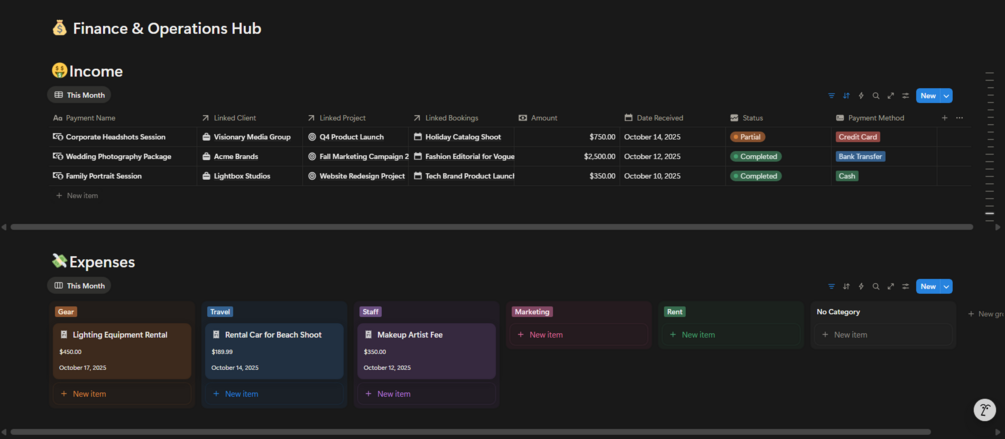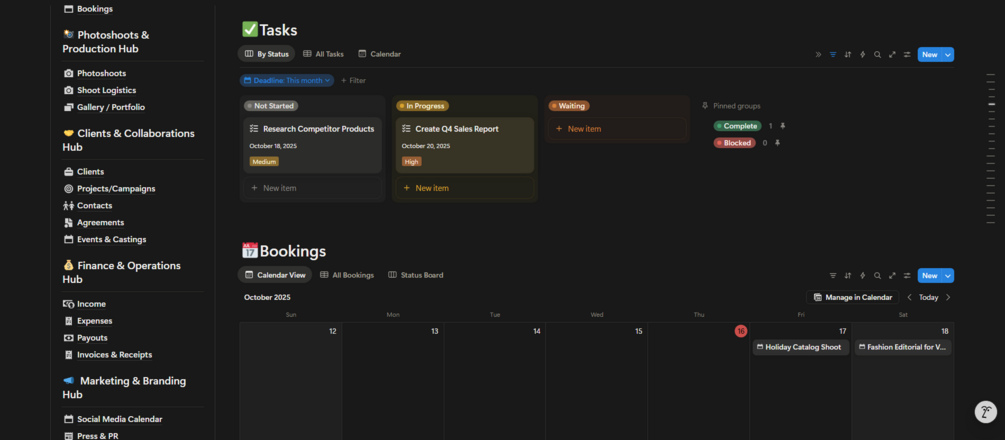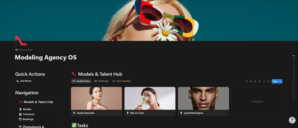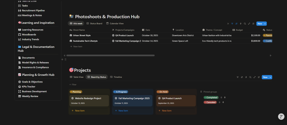 Run your entire modeling agency from one powerful Notion workspace — from bookings, clients, projects, and photoshoots to finances, tasks, and analytics.