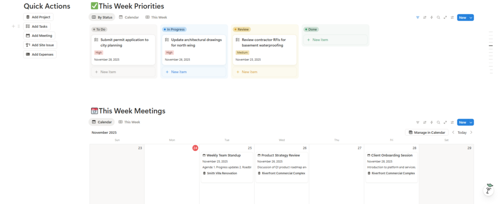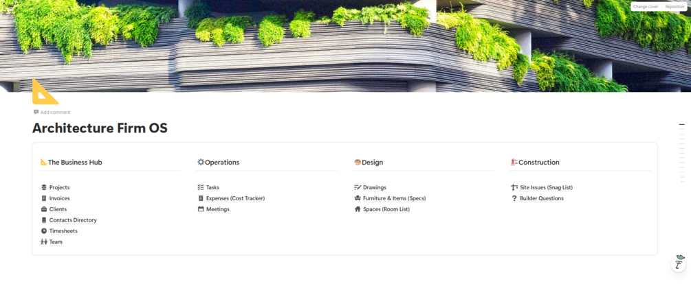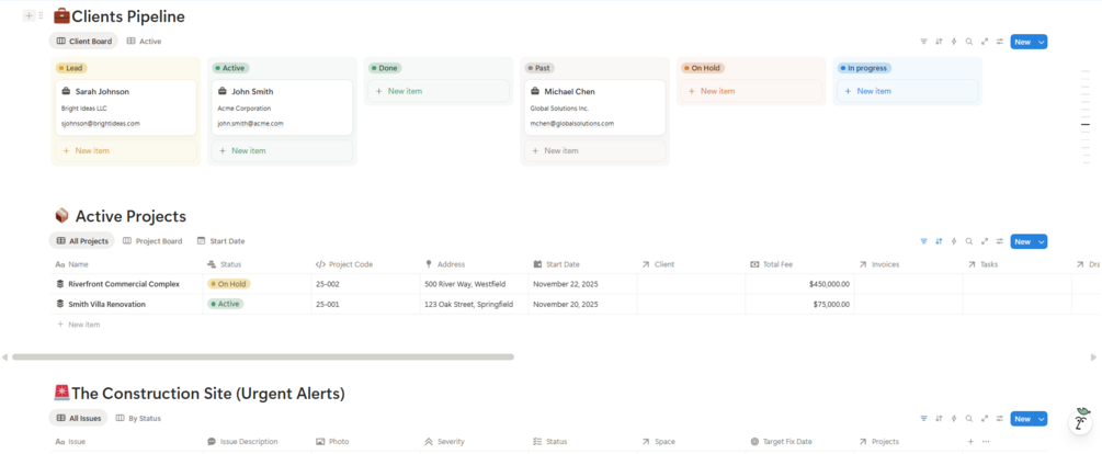 We went beyond simple "To-Do lists." This system features 14 interconnected databases designed to mimic the actual workflow of a real architecture studio—from the first client meeting to the final construction punch list.