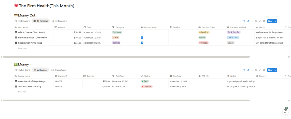 - Reimbursable Expenses: Track printing and permit fees that need to be billed back to the client.