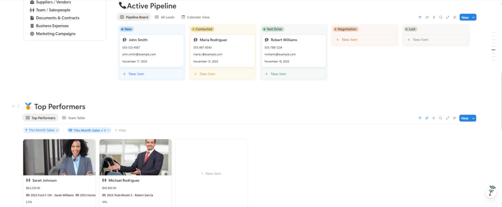 - Pipeline Management: A Kanban board to move leads from "New Inquiry" to "Test Drive" to "Sold."