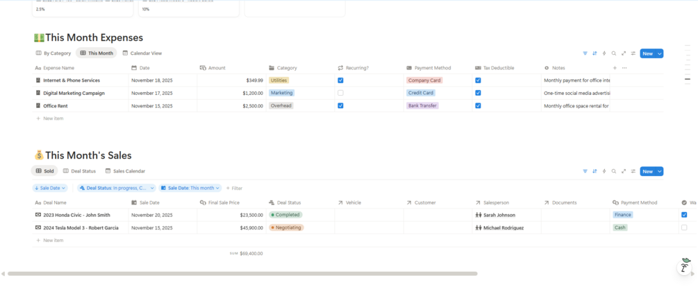 - Sales & Deals: Create professional deal records with payment methods, warranty info, and final sale prices.