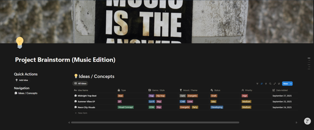 - 🎵 A Single, Powerful "Ideas/Concept" Database: The entire template is built on one simple table. It's your quick-capture inbox for every idea, from a simple lyric or melody to a full album concept.