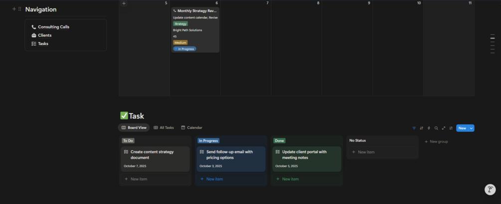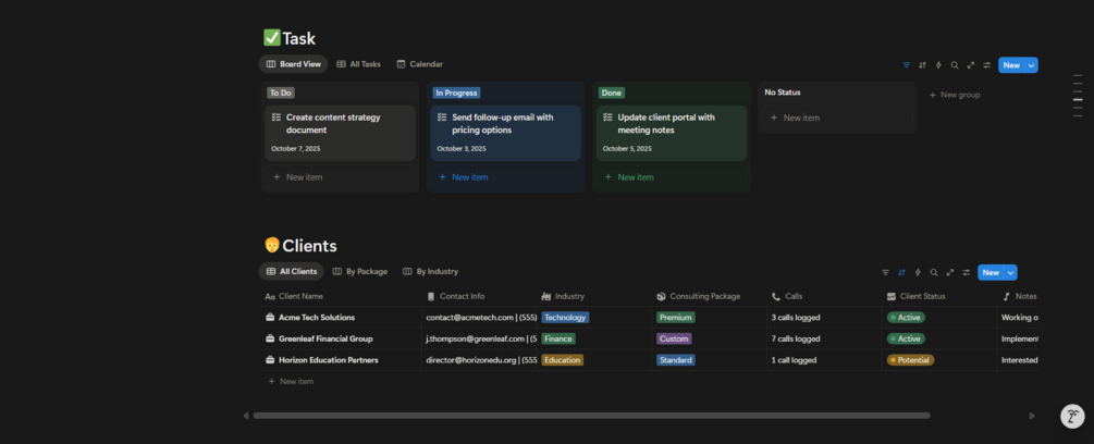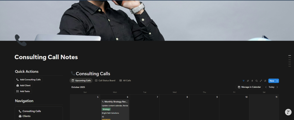 • πŸ—’οΈ Consulting Calls β€” Log key details, outcomes, and next steps from each client session.