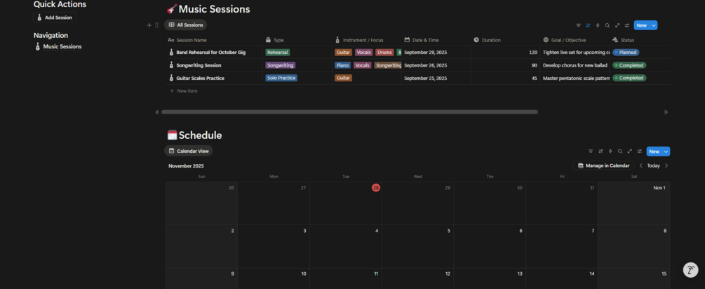 - 📝 A "Music Sessions" (Table View): This is your master log. See all your past and future sessions. Add notes on what you worked on (e.g., "Practiced C# minor scale," "Worked on new synth patch") to track your progress over time.