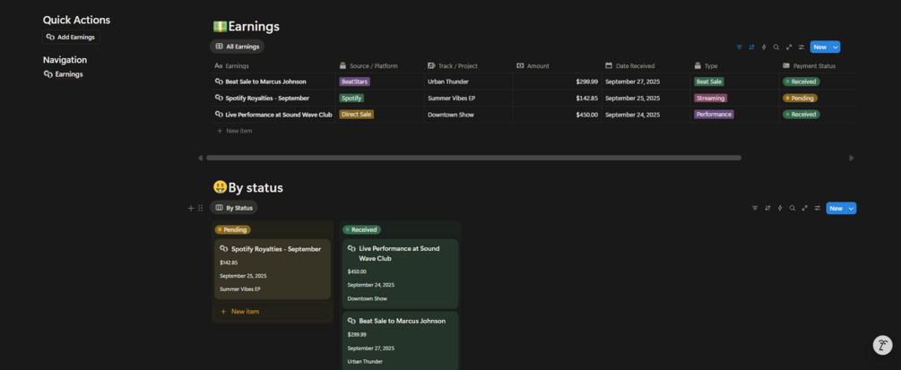 - 🎵 A Single, Powerful Earnings Database: This entire tracker is built on one simple table. No complex accounting, just one place to log all your income.