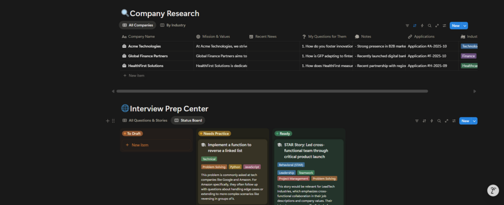 • 🧠 Interview Prep Center: Walk into every interview prepared to win. This hub features two interconnected databases to manage common questions, build a bank of your best STAR method stories, and store detailed research on every company.