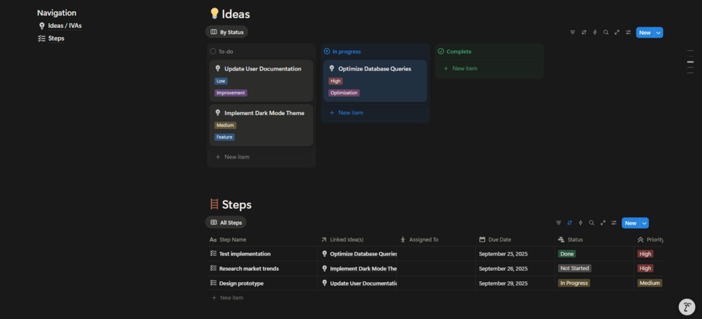 • 🎯 Tag and categorize ideas by theme, priority, or feasibility.
