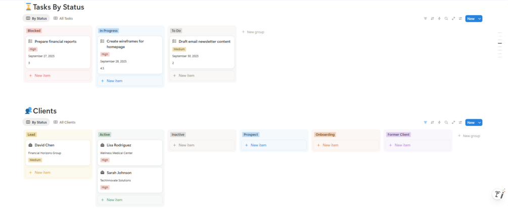 • πŸ“ Knowledge Base β†’ keep client notes, session notes, and resources structured.