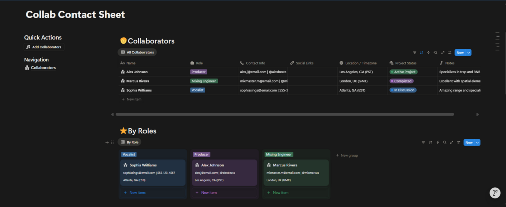 - ⚡ Find People Fast: Use Notion's filters to instantly find the right person. Search for "all vocalists" or "all producers I met last month." Stop digging through DMs and start building real relationships.
